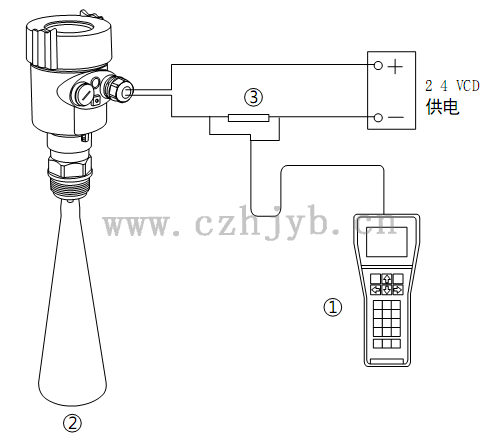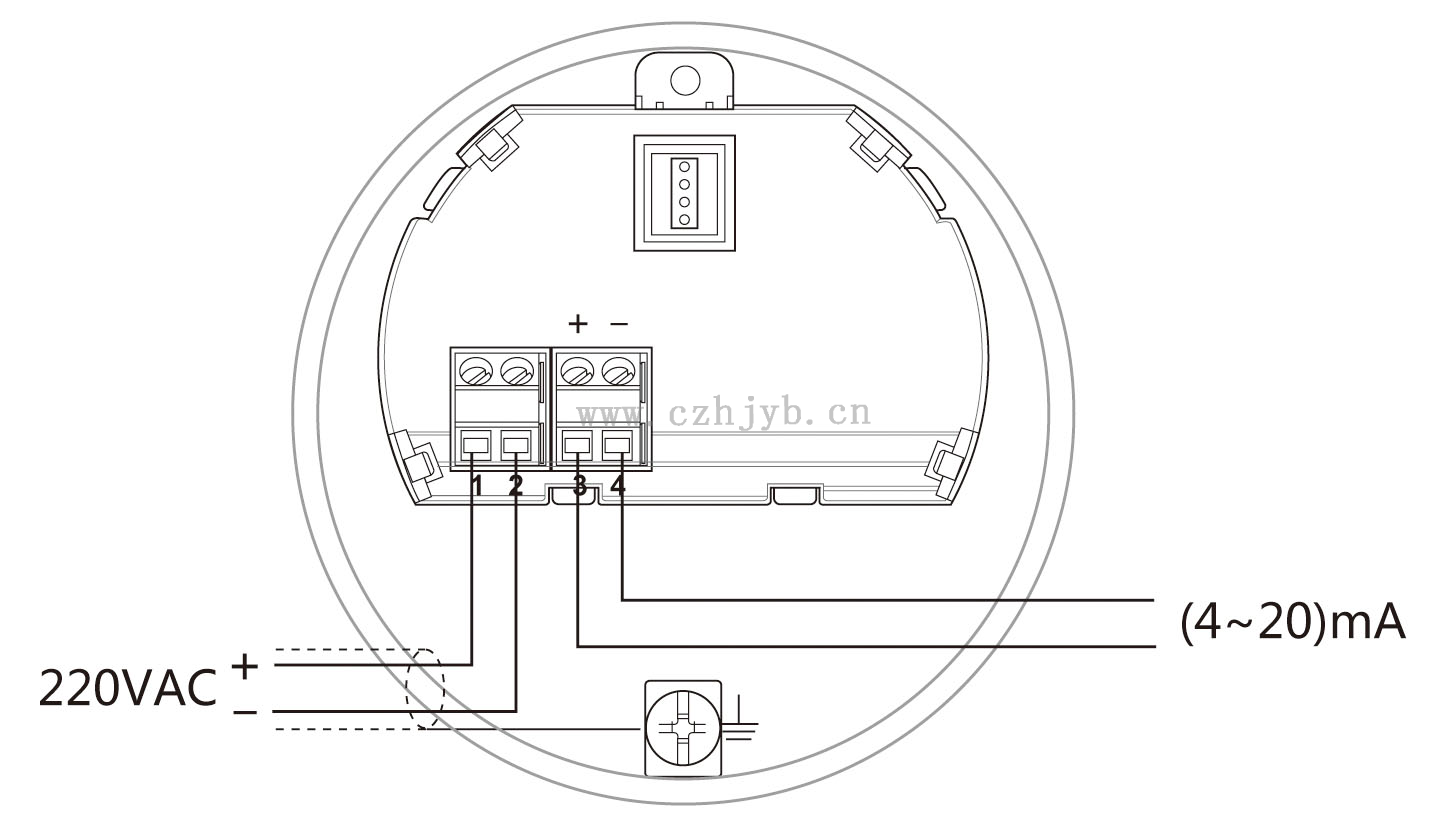 (4~20) mA/HART(兩線制) 供電電源和輸出電流信號共用一根兩芯屏蔽電纜線。具體供電電壓范圍參見技術數(shù)據(jù)。對于本安型須在供電電源與儀表之間加一個安全柵。